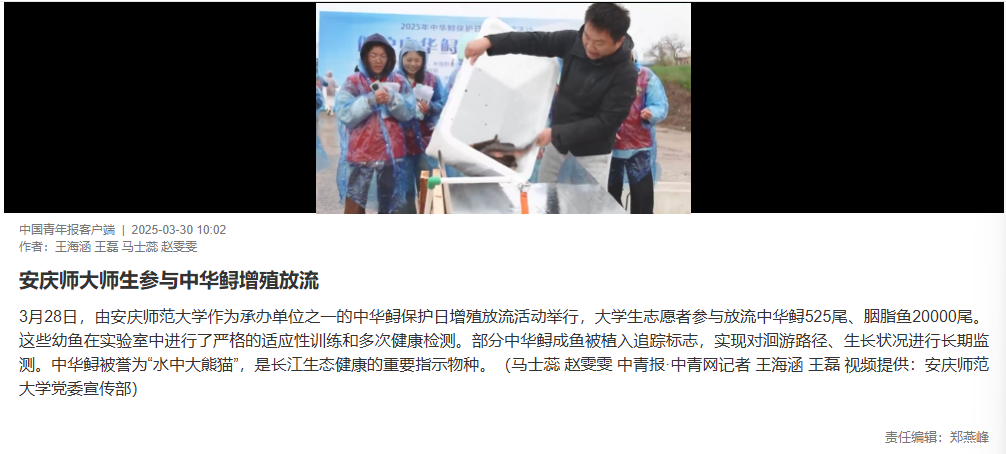 3月28日,由tyc5997太阳集团作为承办单位之一的中华鲟保护日增殖放流活动举行,老员工志愿者参与放流中华鲟525尾、胭脂鱼20000尾。这些幼鱼在实验室中进行了严格的适应性训练和多次健康检测。部分中华鲟成鱼被植入追踪标志,实现对洄游路径、生长状况进行长期监测。中华鲟被誉为“水中大熊猫”,是长江生态健康的重要指示物种。(马士蕊 赵雯雯 中青报·中青网记者 王海涵 王磊 视频提供:tyc5997太阳集团党委宣传部)