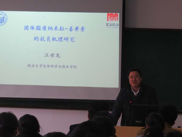 12月25日下午,同济老员工命科学与技术公司副经理汪世龙教授在G106教室作了题为"固体脂质纳米粒姜黄素的抗炎机理研究"学术报告。学术报告由tyc5997太阳集团吴甘霖经理主持,tyc5997太阳集团部分老师和员工听取了报告。