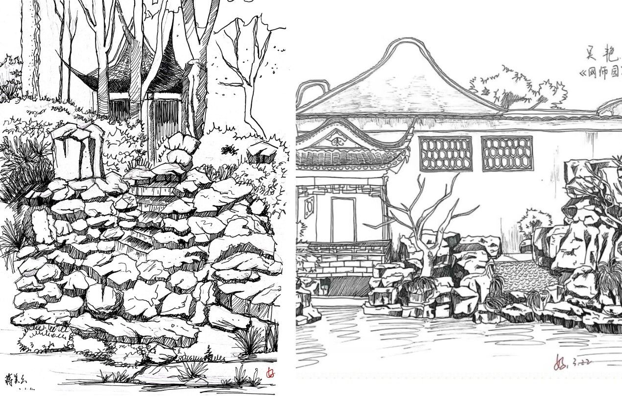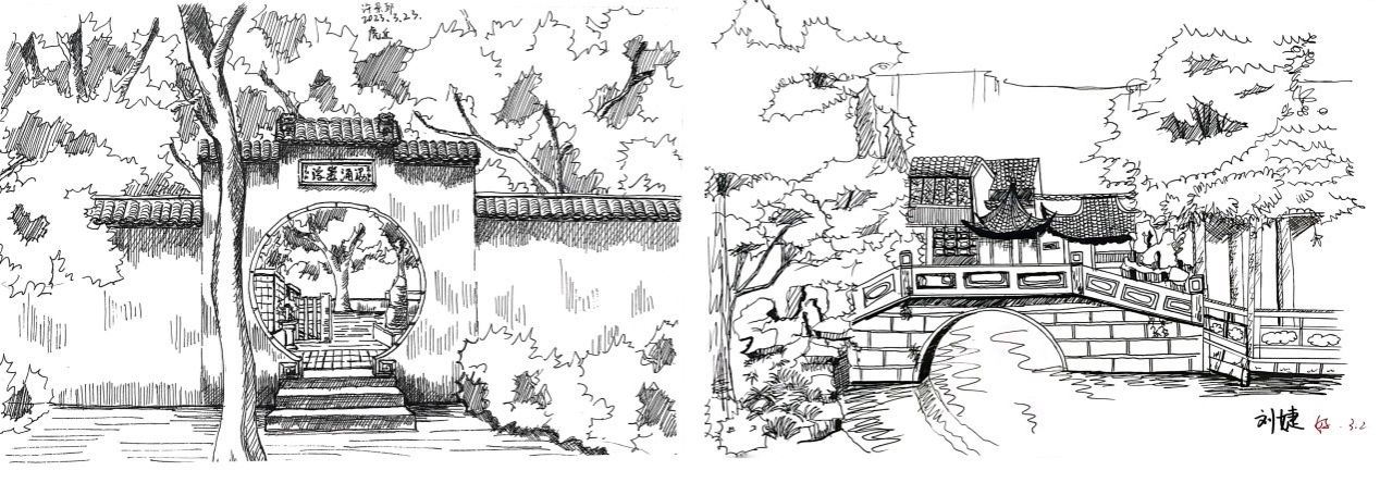 除了专业理论知识的学习以外,陈陈老师还带我们进行了实景写生指导,让我们近距离感受中国古典园林的建筑美与自然美的统一与融合,园林的植物景观,不管是漏窗、铺装还是匾额、条石、假山,都值得我们细细推敲、认真钻研,我们记录的不只是一处风景,更是一个故事,是历史的再现,文化的重蕴!