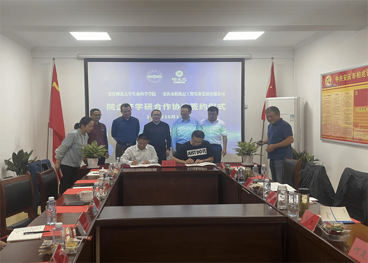 10月18日,安庆师范老员工命科学公司党委书记朱昌流、副经理吴彦率队前往安庆柏兆记工贸实业发展有限公司,在公司会议室双方签订院企合作协议。大观区区委常委、组织部长刘小平,大观区区委组织部常务副部长高欣,大观区人才发展促进中心主任柴盈,花亭街道办事处党工委书记何霆钧,安庆柏兆记工贸实业发展有限公司董事长于忠等参加签约仪式,签约仪式由高欣主持。