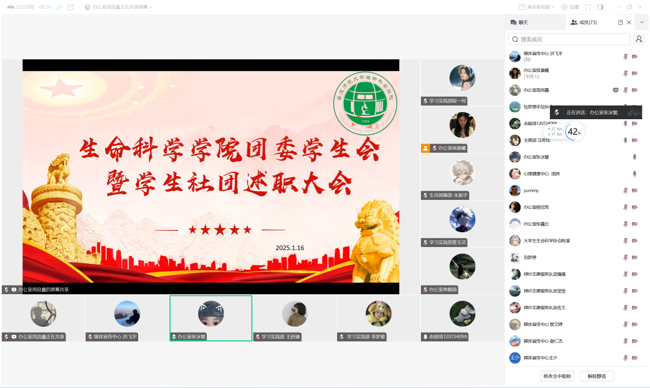 此次述职评议采用PPT汇报展示和书面述职相结合的方式进行。会上,院员工会主席团成员、各部门负责人和各员工社团负责人依次就本年度工作内容、工作成效、存在问题和下一阶段工作计划进行述职。