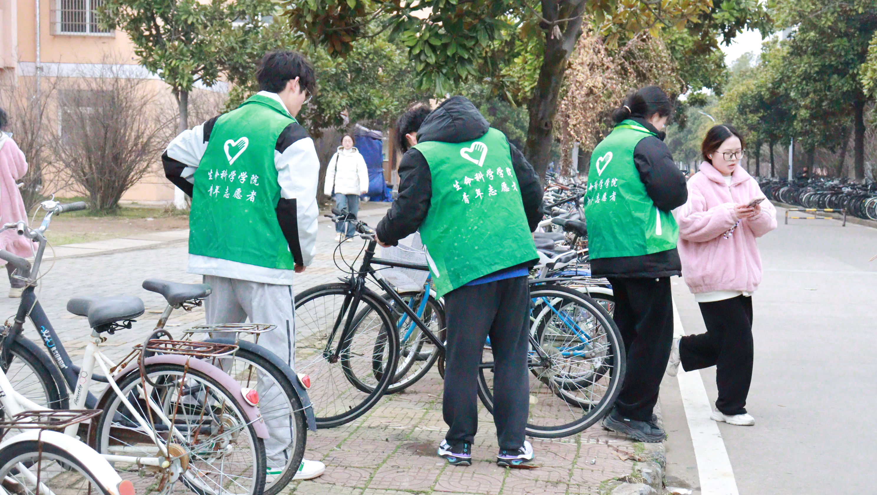 3月5日,2024级生物科学类4班全体同学发起“净湖行动”,40余名员工手持垃圾夹、环保袋,对校园双龙湖周边、绿化带进行“地毯式”清理。同学们分组协作,捡拾塑料瓶等废弃物,并分类投放到垃圾站。活动累计清理垃圾10余袋,同时通过现场讲解垃圾分类知识,呼吁更多人关注环境问题。当天,绿叶志愿服务队在东苑食堂门口开展了一场以“扶正的车轮,滚动春日的善意”为主题的志愿服务活动,在按照预先划分好的区域内,有条不紊地开始扶起倒地、停放不规范的自行车。“弯腰捡起的不仅是垃圾,更是对地球的责任。扶正的不仅仅是车轮,更是春日的善意。”2024级生物科学专业单麟涵说道。