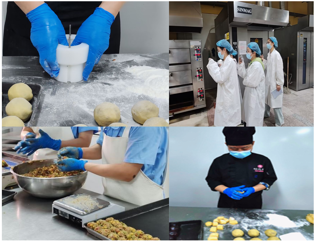 在工坊生产车间,实践团成员们亲眼目睹了糕点制作的全过程。搅拌机轰隆作响,将面粉和水搅拌成光滑的面团。师傅们手法娴熟,将面团压成薄皮,再将切好的肉馅、玉米粒和蔬菜丁均匀地包入其中。每一个动作都精准而流畅,仿佛在进行一场无声的舞蹈。