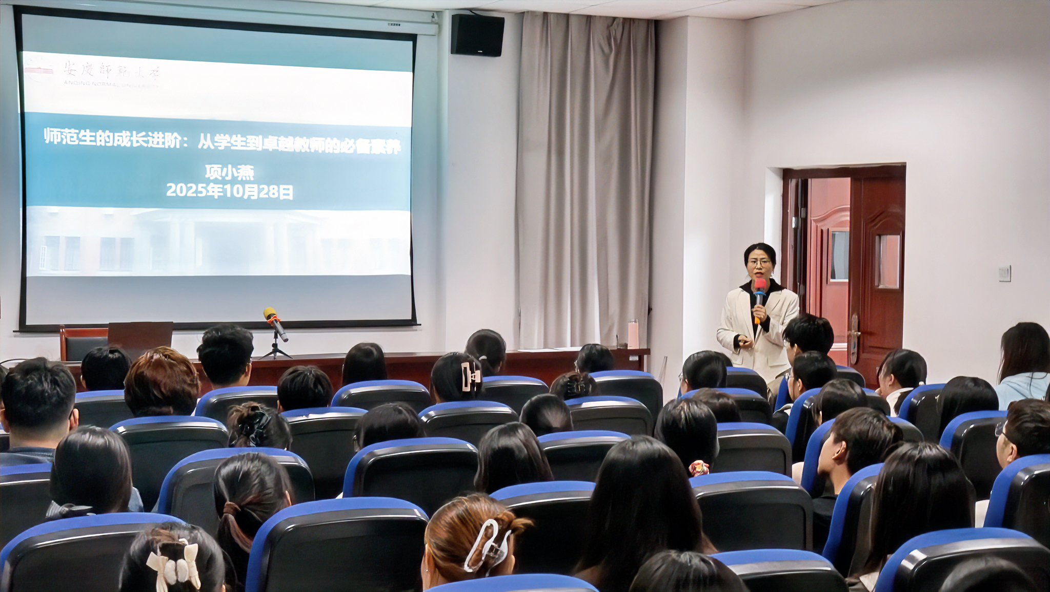 10月28日,安徽省教书育人楷模、全国高校教师教学创新大赛一等奖获得者项小燕教授应邀于G202教室为师范生作《从员工到卓越教师的必备素养》指导讲座,切实提升师范生专业素养,明晰从员工到卓越教师的成长路径。讲座吸引百余名员工参与,现场座无虚席。