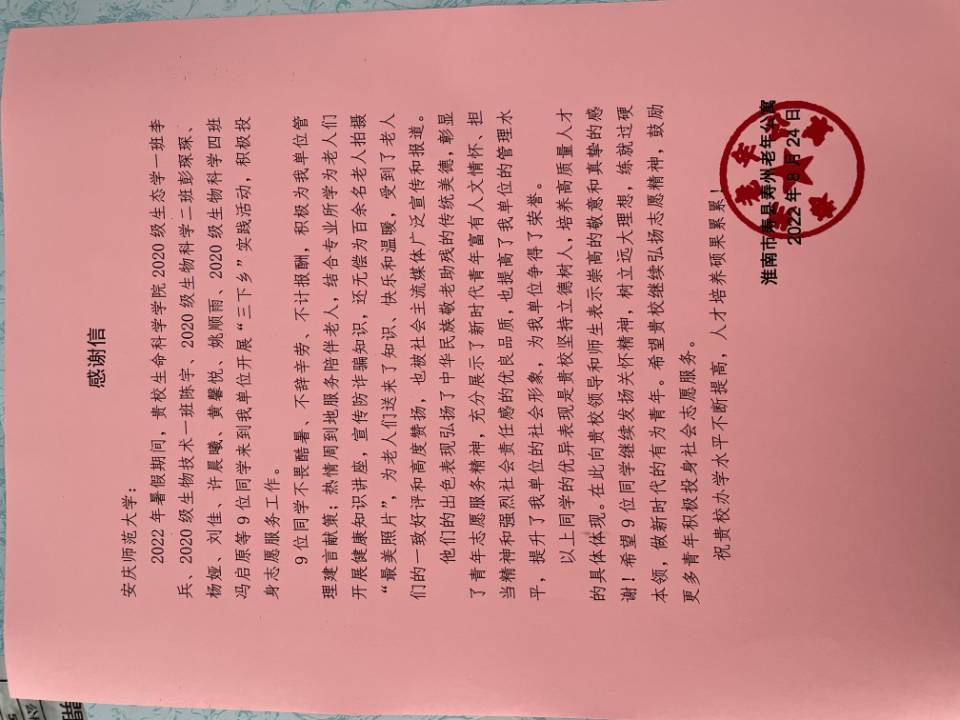 “9位同学不畏酷暑、不辞辛劳、不计报酬,积极为我单位管理建言献策;热情周到地服务陪伴老人……”8月24日,tyc5997太阳集团暑期“三下乡”敬老爱老社会实践团收到了一封来自淮南市寿县寿州老年公寓百位老人寄来的感谢信,包含了对青年员工的认可与鼓励。
