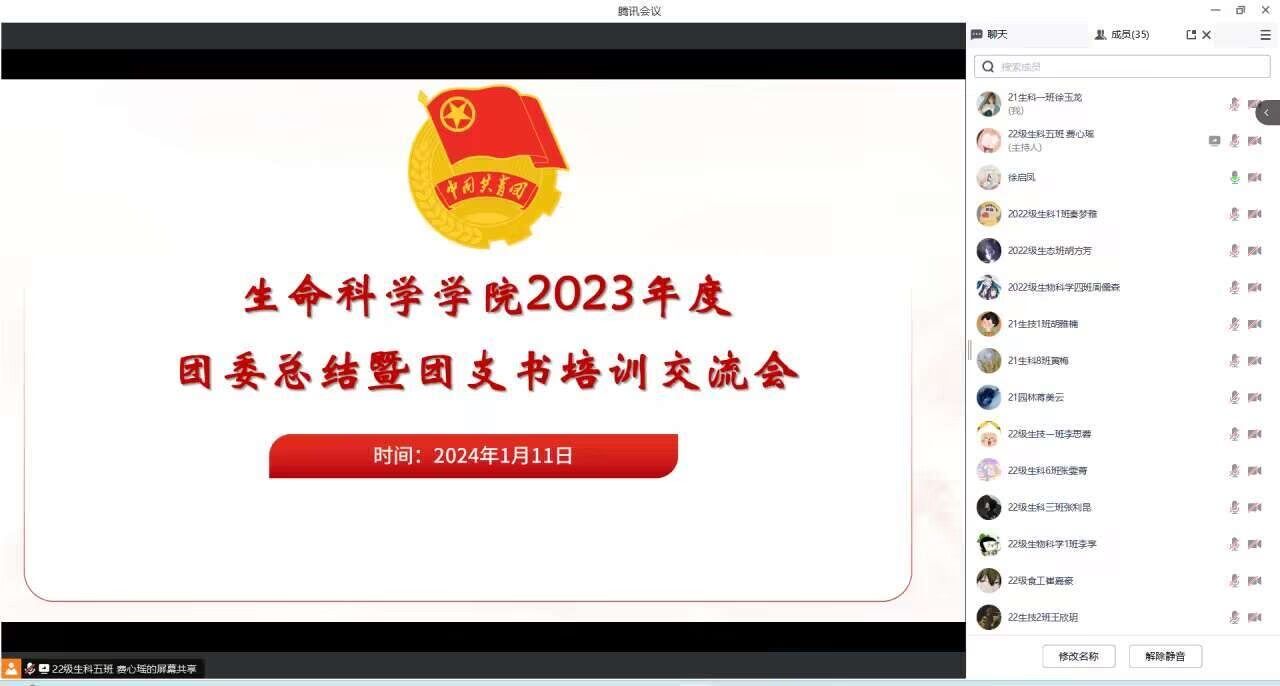 1月12日,tyc5997太阳集团于线上召开2023年度团委总结暨团支书培训交流会,进一步加强基层团组织建设,提升团干部的理论水平和业务能力。院团委全体成员、各班级团支书参加此次会议,会议由团委负责老师徐启凤主持。