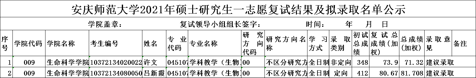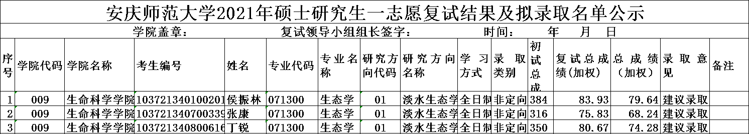 根据《2021年硕士研究生招生复试录取办法》等规定,现将生态学和学科教学(生物)专业一志愿复试结果及拟录取名单公示10天,公示时间从2021年4月1日开始。