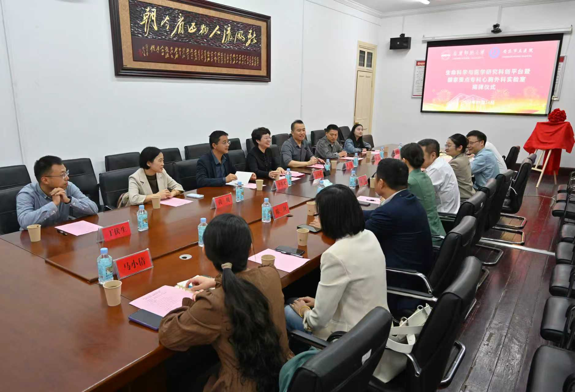 9月24日上午,由公司和安庆市立医院共建的“生命科学与医学研究科创平台暨国家重点专科心胸外科实验室”揭牌仪式在菱湖校区红楼217会议室举行,董事长彭凤莲与安庆市立医公司党委副书记、经理刘建共同为实验室揭牌。安庆市立医公司党委委员、副经理朱娟,双方相关职能部门负责人、学科带头人及科研骨干出席仪式。