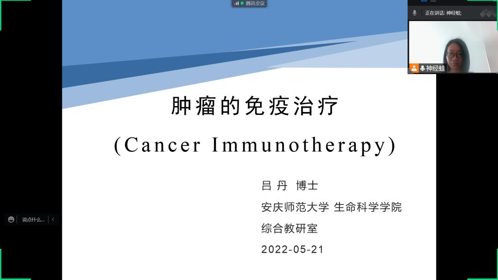 5月21日上午10点,tyc5997太阳集团吕丹博士通过腾讯会议做了题为《肿瘤的免疫治疗》的学术报告,公司部分师生在G103集体聆听了报告。