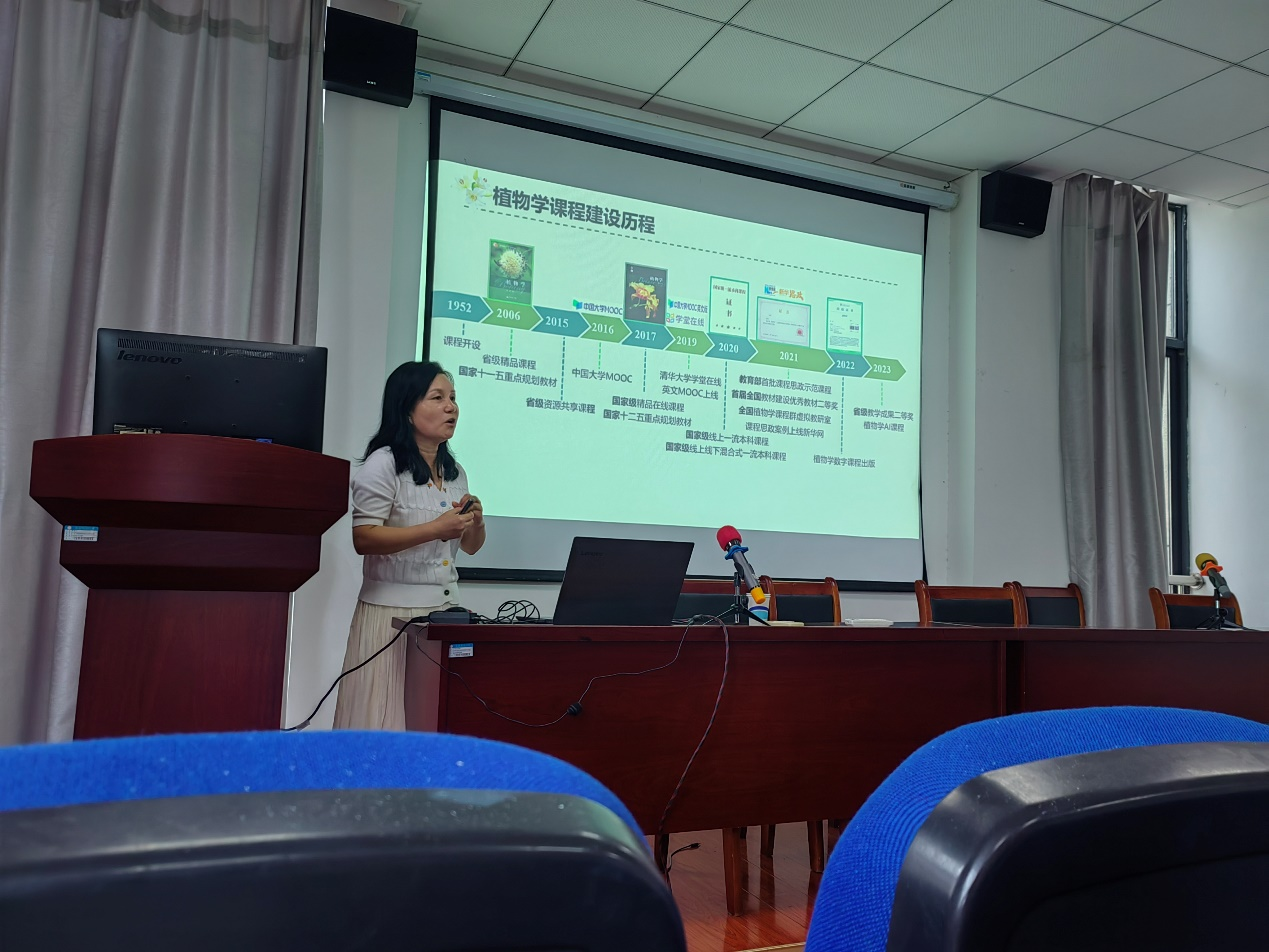 随后,赵毓教授以植物学课程为例,从一流课程概况和建设历程、一流课程建设、一流课程建设成效等三个方面详细介绍了植物学的教学过程。她通过丰富的案例和生动的讲解,展示了“三段递进”混合式教学在提升员工科学素养、增强学习兴趣和创新能力方面的重要作用,最终实现让员工“心中有数”、“目不转睛”、“念念不忘”和“温故知新”的教学目标。