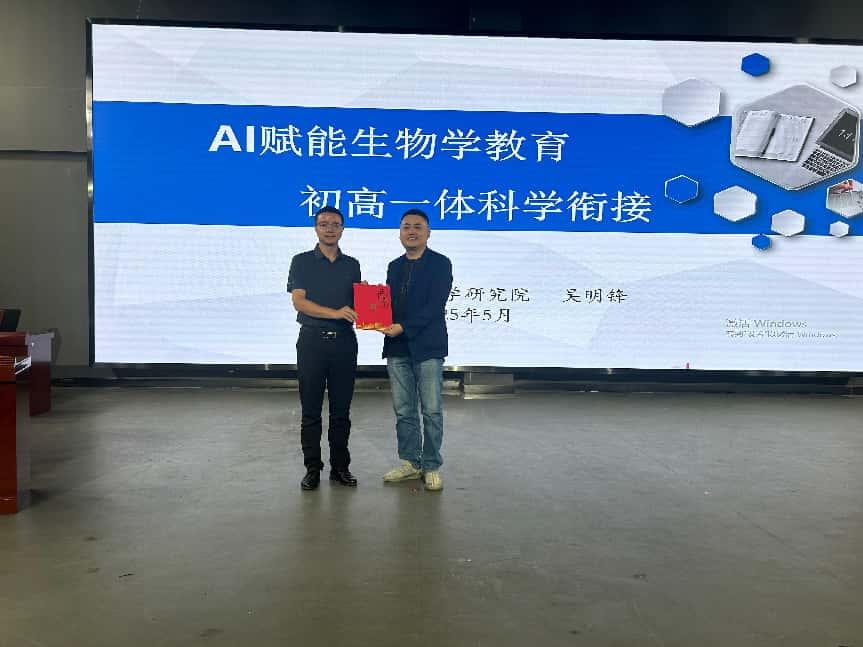 吴明锋老师以AI技术在生物学教育中的应用展开讲解,结合大量实际案例,从落实依标教学、教学理念转型、评价体系转向和初高一体衔接四个方面展示了AI工具在教学资源开发、课堂互动、员工个性化学习指导等方面的独特优势,为在场师生带来全新教学思路。讲座结束后,副经理李从虎副代表公司向吴明锋老师颁发荣誉证书,对其带来的精彩讲座表示感谢,并期望未来能在教学与科研等方面进一步合作交流。