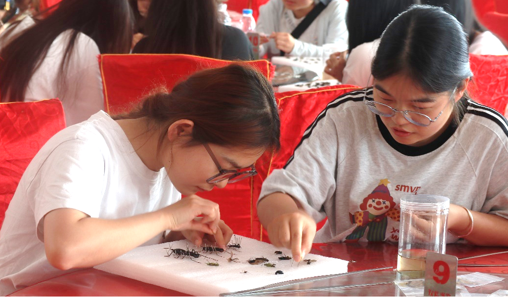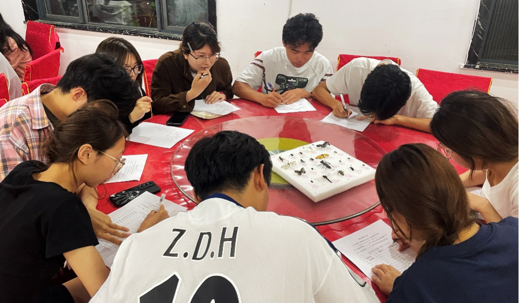 每日午后,驻地标本制作室便成为师生们的“第二课堂”。在植物学教师胡淑宝博士的指导下,同学们依次完成标本鉴定、整理、上台纸、固定、贴标签等工序。动物标本制作区,陈敏敏博士指导员工对采集到的昆虫进行整姿,用昆虫针固定其身体姿态,触角、足等部位都需按标准摆放;接着进行干燥处理,将整姿后的昆虫放入干燥箱或通风处晾干;最后在标本上贴上标签,注明昆虫名称、采集时间、地点等信息,制成完整的昆虫标本。