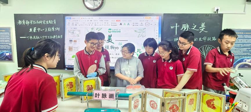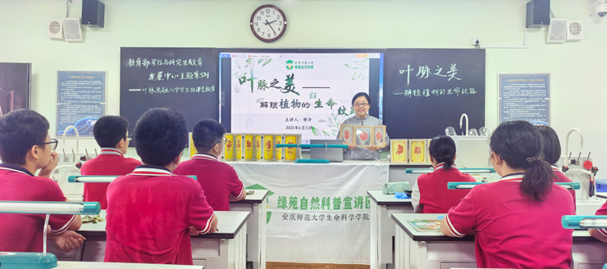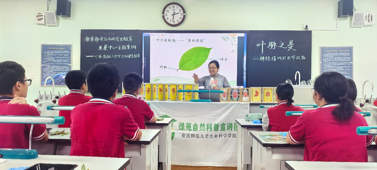 教育部2024年度主题案例“叶脉画融入中员工物课堂教学”,于近日在安庆市第四中学八年级生物学课堂中开展。本次示范课为响应安徽省植物学会的号召,以 “叶脉之美——解锁植物的生命纹路” 为主题,以生物学学科核心素养为引领,创新性地将非物质文化遗产“叶脉画”技艺与中员工物学教学深度融合,旨在构建“科学探究+艺术创作+劳动实践”三位一体的特色教学模式。