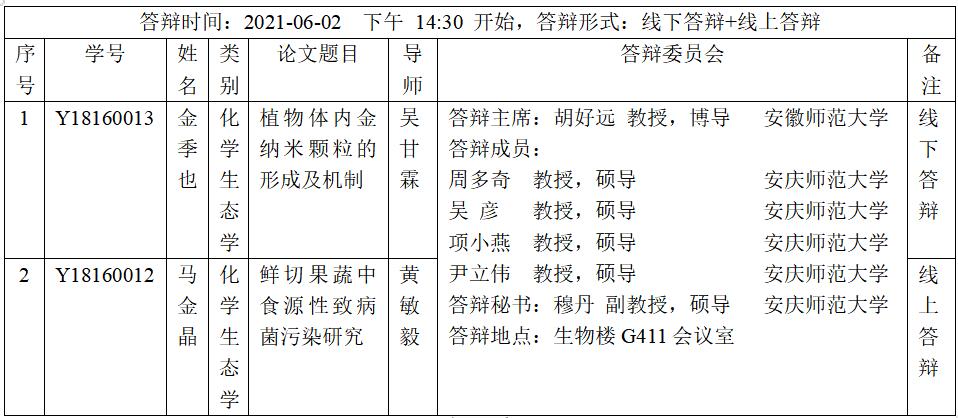 tyc5997太阳集团2021届化员工态学硕士研究生学位论文答辩安排表