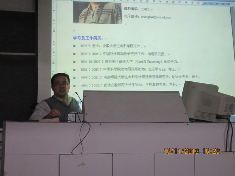 11 月 16 日 下午,中国动物学会两栖爬行动物学分会理事、安徽大学张保卫博士应邀在菱湖校区414教室作了“长江中下游区域小麂系统地理和群体遗传学分析:基于mtDNA控制区序列变异”专题学术讲座。tyc5997太阳集团100多名师生聆听了报告,报告会由tyc5997太阳集团副经理魏和平博士主持。